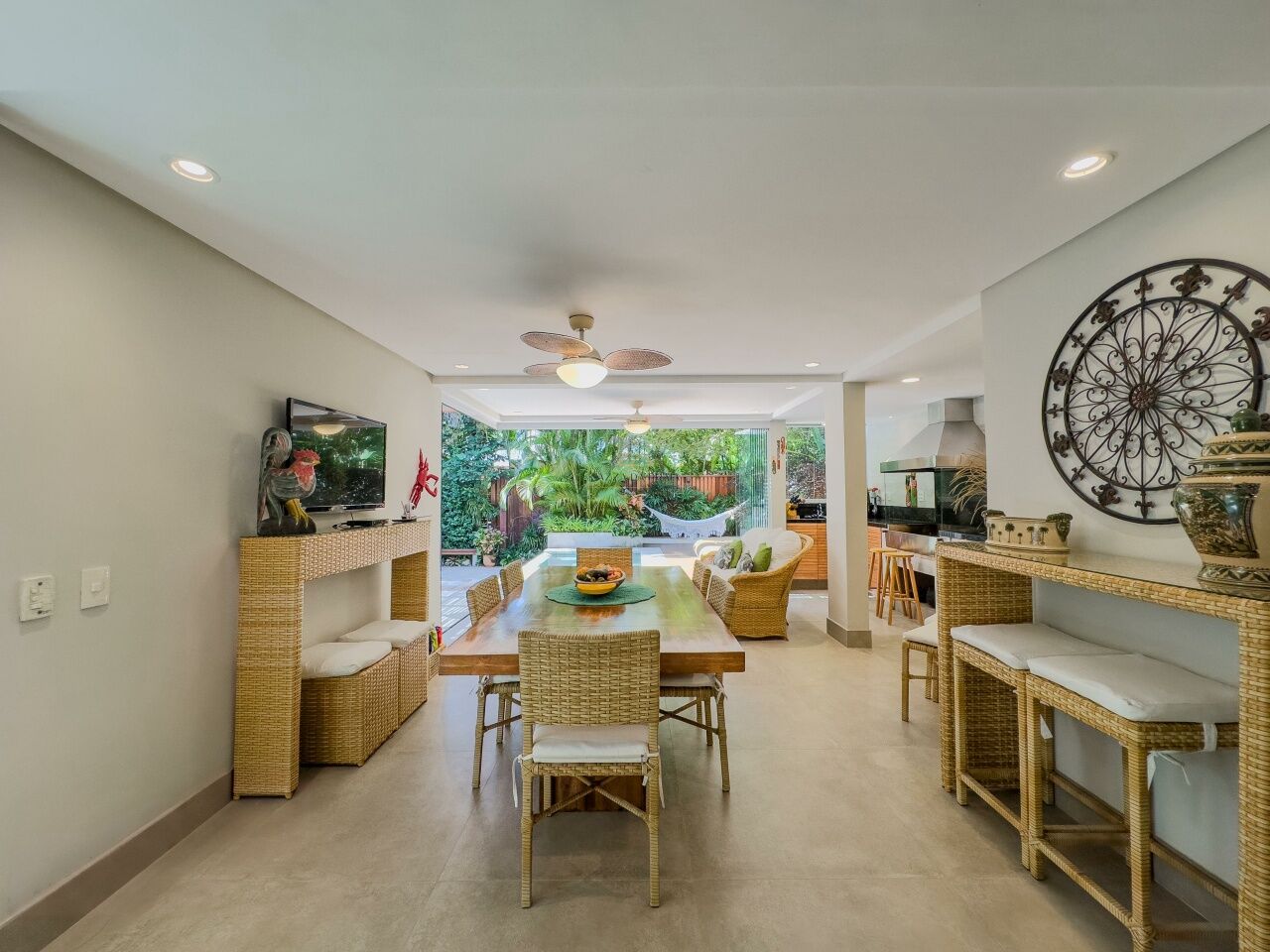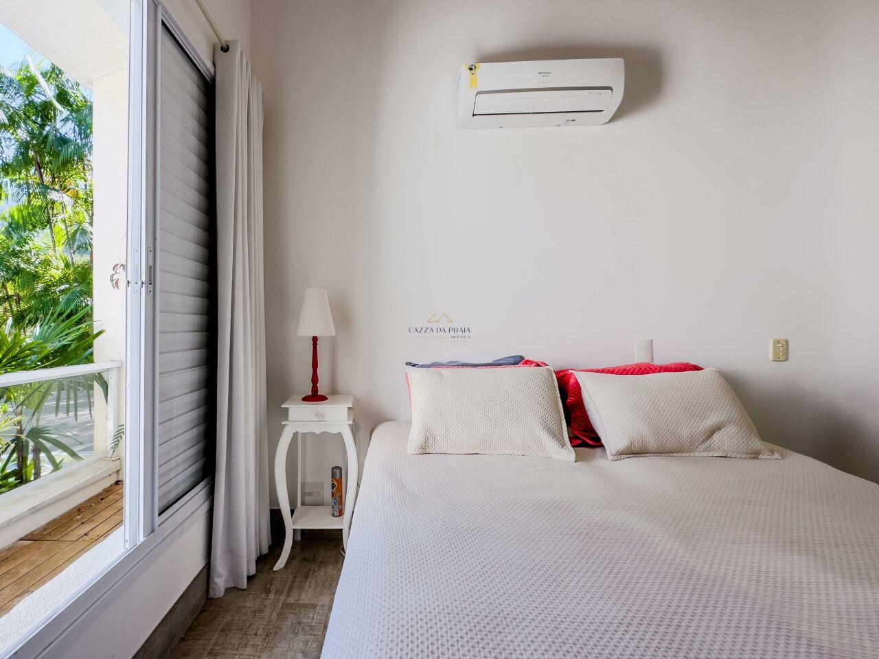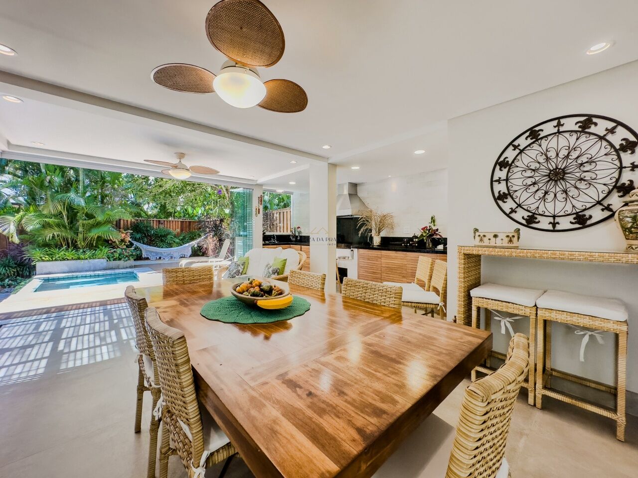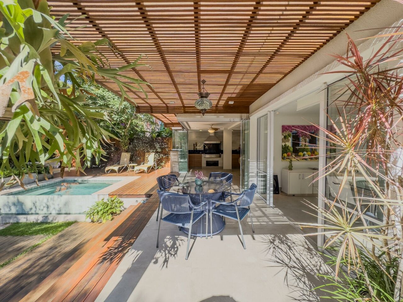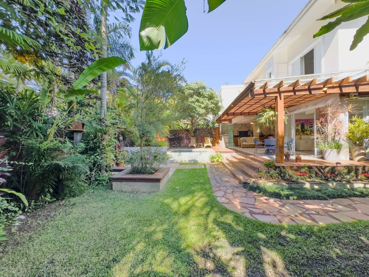 A área externa oferece churrasqueira gourmet, varanda mobiliada, piscina com jardim paisagístico. A casa é totalmente mobiliada, com móveis planejados e ar-condicionado em todos os ambientes, além de 2 vagas de garagem.