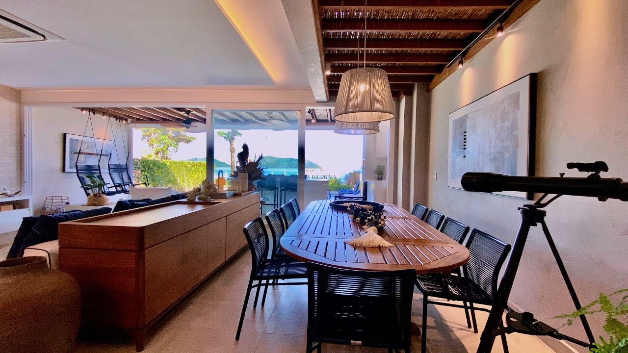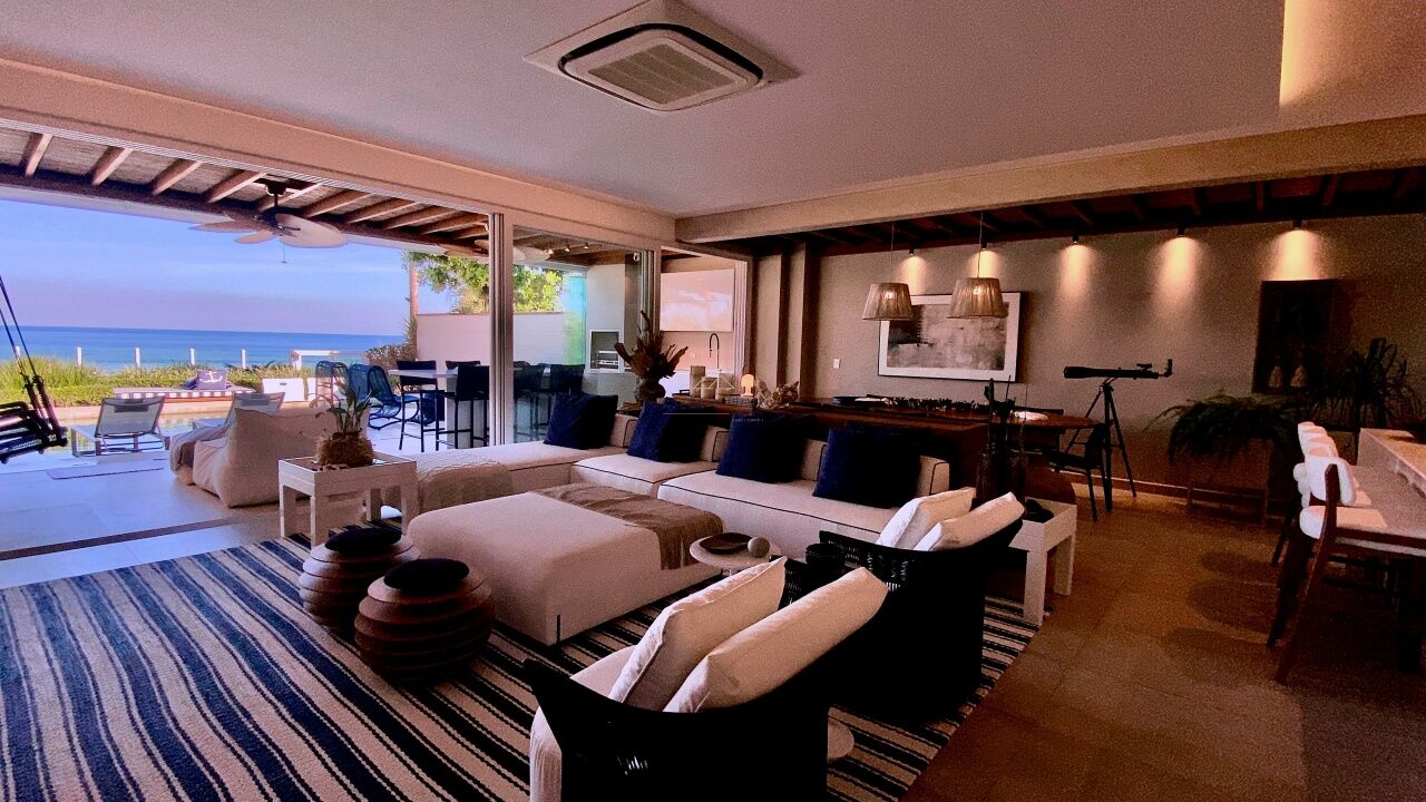 A residência conta com 4 suítes amplas, sendo duas com closet, além de uma área social elegante com cozinha integrada e living distribuído em quatro ambientes, proporcionando conforto, fluidez e integração. A sala conecta-se diretamente à varanda, à área gourmet com churrasqueira e à piscina, criando um cenário ideal para lazer à beira-mar.
