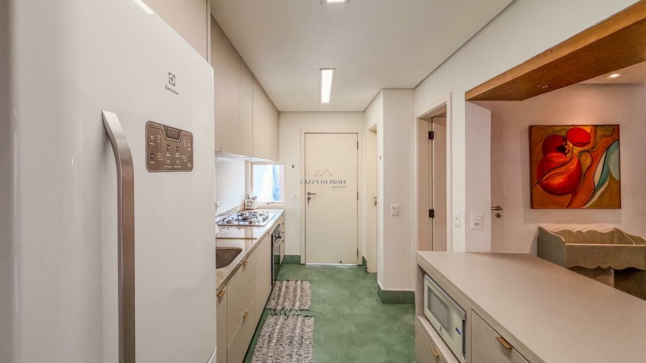 Na área externa, a varanda gourmet com churrasqueira convida para momentos especiais. O condomínio oferece uma estrutura completa com piscina, solarium, ampla área verde, portaria 24 horas, zeladoria e serviço de praia, garantindo segurança e comodidade à beira-mar.
